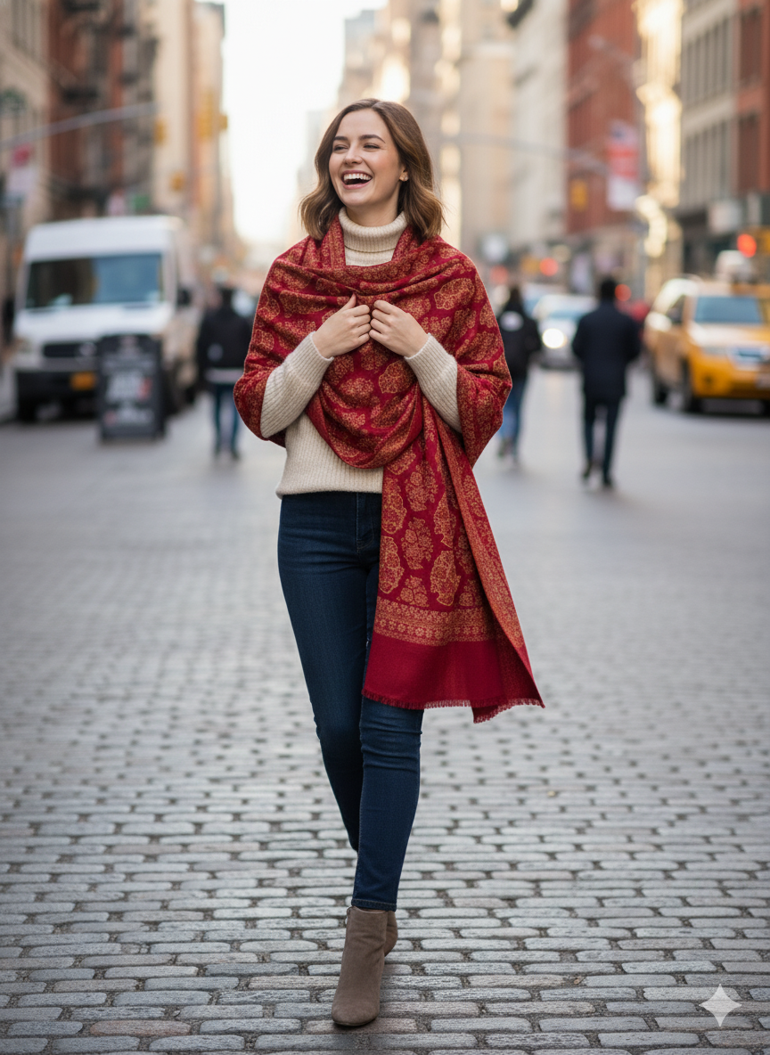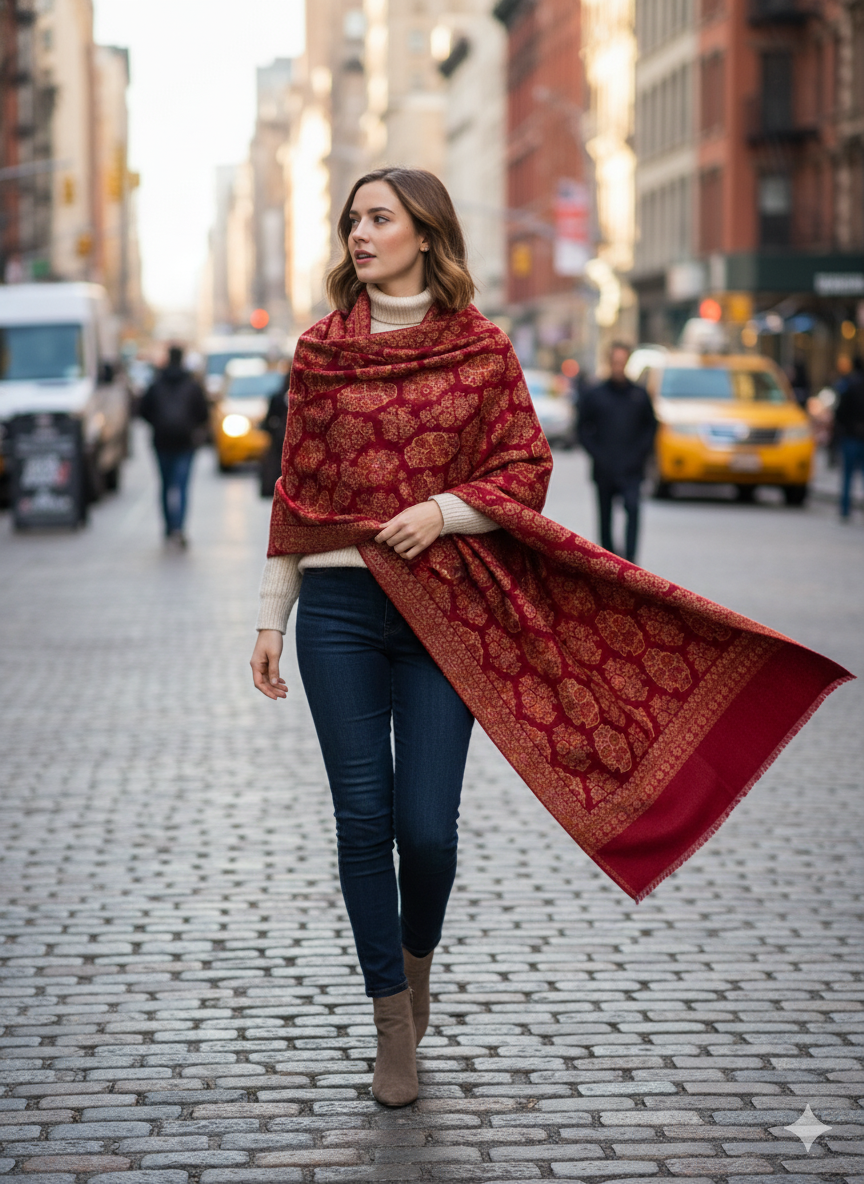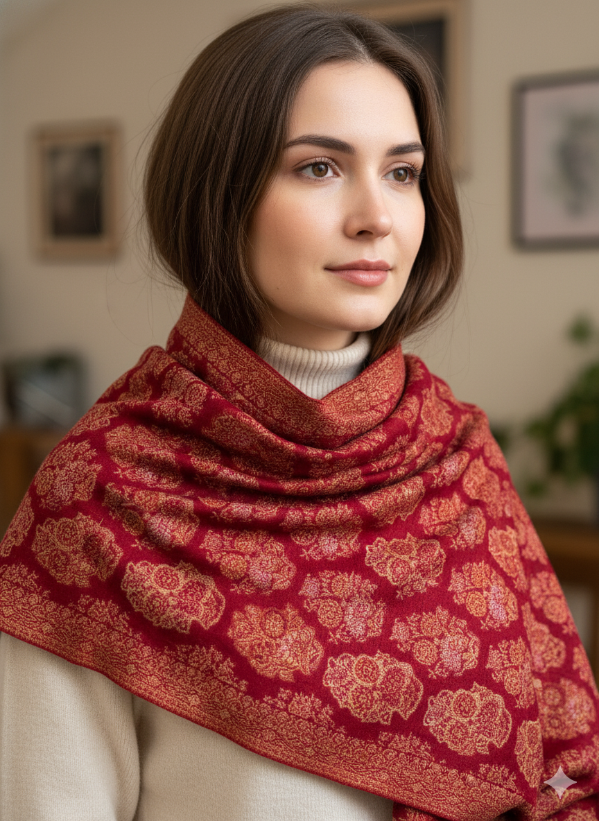 This Ornate Red Jamawar Shawl is a vibrant celebration of fine craftsmanship. Woven from a plush wool blend, its detailed Jamawar motifs create a striking visual contrast against the rich red backdrop. Perfect for festive occasions or elevating everyday style, this shawl combines warmth with timeless artistry, making it a cherished accessory for any wardrobe.