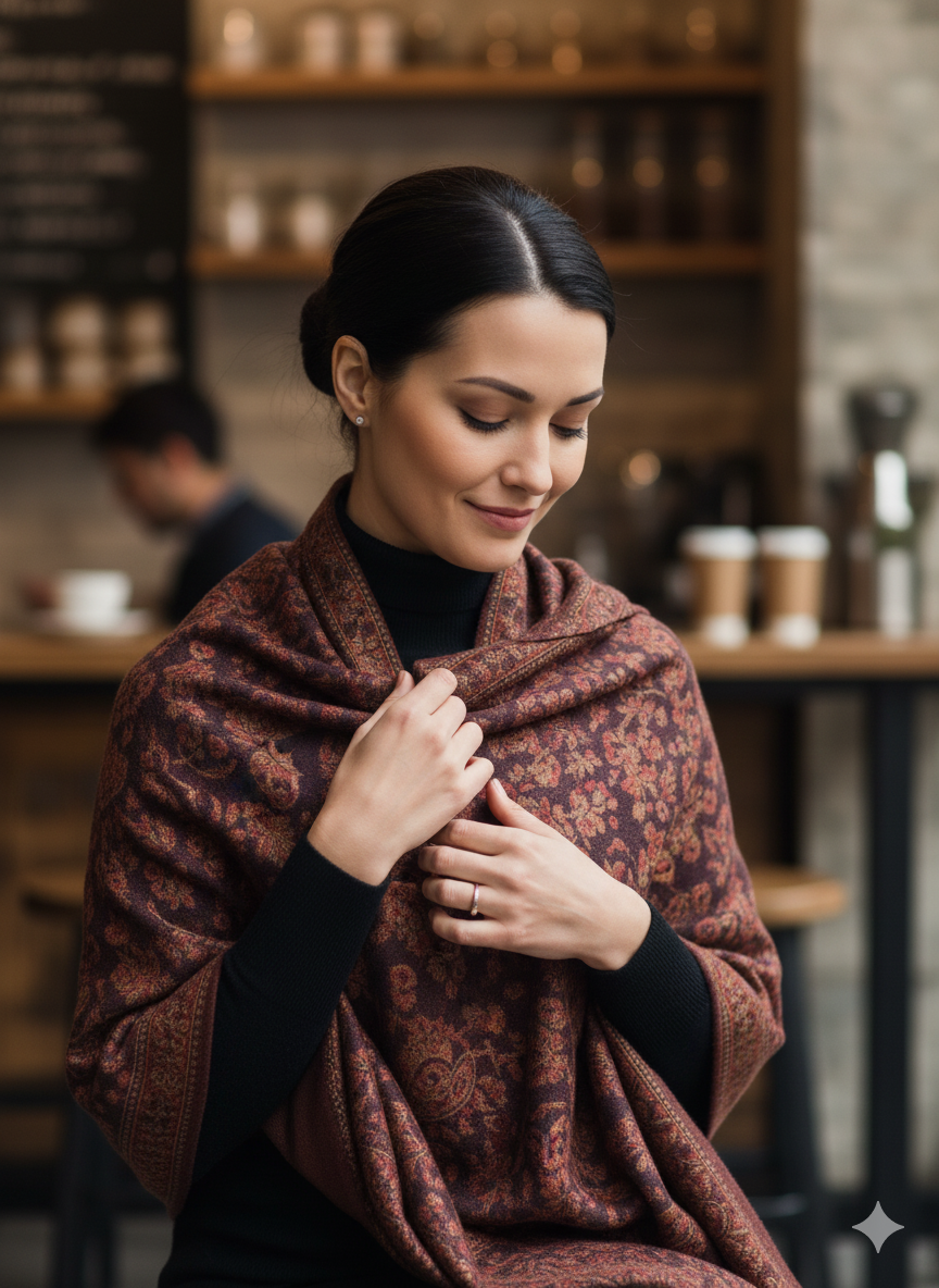 The versatility of this shawl astounds me. It's perfect for draping over my shoulders on cool evenings, wrapping snugly around my neck on colder days, or adding a touch of sophistication to a simple outfit.