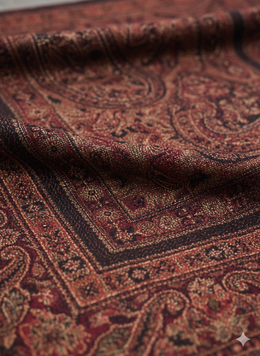 This Classic Black and Maroon Jamawar Shawl features intricate detailing on a luxurious wool blend fabric. Its rich black hue and masterful craftsmanship make it a versatile accessory to add depth and tradition to any outfit.